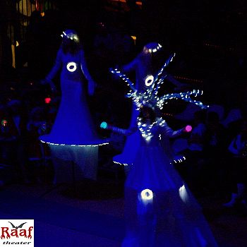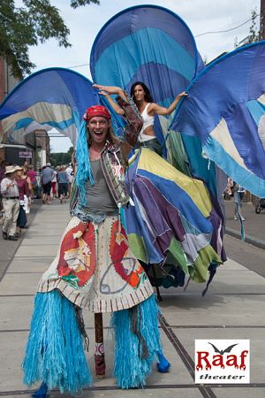 Das Stelzentheater Raaf hat viele fantastische Stelzenfiguren. Walt Raaf entwirft und näht die Kostüme für die Stelzen- und Straßentheater-Shows. Die Kostüme sind prächtig und die Art, wie das Stelzentheater spielt, ist wunderbar anzuschauen. Er ist ebenso Sänger und Songwriter und Gründer des Theatertrucks. Raaf führt seine Kunst seit 20 Jahren auf die Straße, zuerst als Duo, inzwischen als Familie. Sie besuchten das ViaThea in Görlitz dieses Jahr mit dem Stelzen Walk Act “Wittvogel”. In Erfurt waren Sie beim Empfang der Gäste eines Firmenjubiläums mit dem Act “Schmetterlinge”. Auch die Kindershow “Raven tot the Origin” spielte die Familie Raben oft. Von Luxemburg nach Belgien und eine Tour entlang der Watteninseln. Spielt Familie Raaf auch auf Ihrer Veranstaltung?