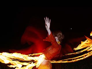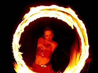 Andächtig entzündet firesnake zu Ehren der Elemente zwischen den Feuertanzeinlagen jeweils eine rote Flamme, in dessen mystischen Schein sie sanft mit dem Wasser spielt, ehrfürchtig die Erde durch die Finger rieseln läßt, in Leichtigkeit mit Seifenblasen tanzt und souverän große Feuerbälle aufflammen läßt.