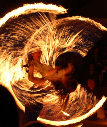 Fackeljonglage, Feuerstab, Swinging, Feuerseile, Feuerschlucken und Stichflammen. Feuershows mit klassischer, popiger oder mittelalterlicher Musik. Solo, Duo oder in größerer Besetzung, Dauer 15-25 min. Außerdem im Programm: Jonglage, Diabolo, Handstand-Akrobatik, Artistik-Theater, Gaukelei, Walking-Acts