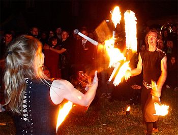 Mit Fackeljonglage, Feuerstab, Feuerschlucken, Fackelswinging, Feuerseilen und großen Stichflammen.