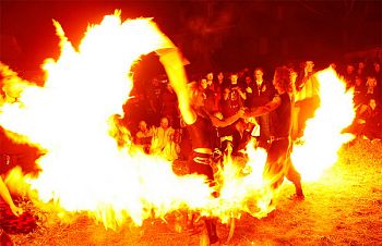 Mit Fackeljonglage, Feuerstab, Feuerschlucken, Fackelswinging, Feuerseilen und großen Stichflammen.