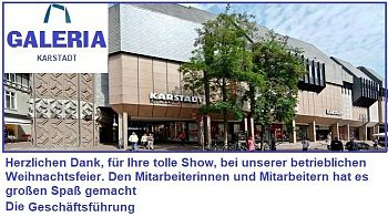 Mit einer Programmdauer von 30 bis maximal 45 Minuten (plus ggf. Zugabe passt die Darbietung in das kleine Kaminzimmer, oder den großen Saal des Restaurants, ins Festzelt, bis auf die ganz große Bühne.